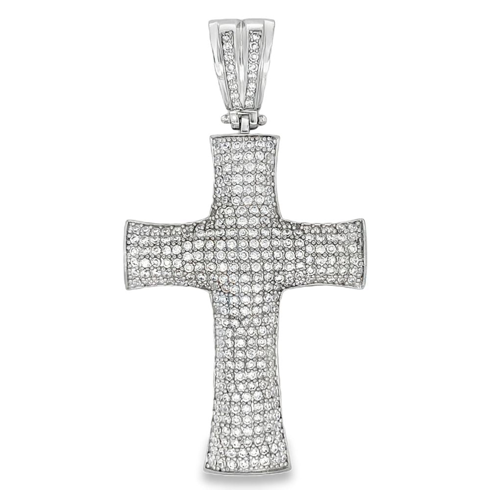 Rounded Cross CZ Iced Out Pendant. This hip hop pendant features round cut simulated diamond stones giving this bling bling charm a unique shine and look to it. Beautifully crafted with precision stone setting. Hot style iced out Pendant that is unique and stands out from the crowd. The VVS CZ Simulated Diamonds have a bling bling shine as if they were genuine diamonds.