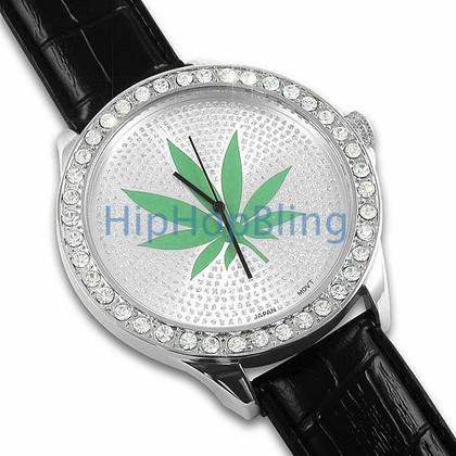 Weed Leaf Silver Black Leather Bling Bling Watch
